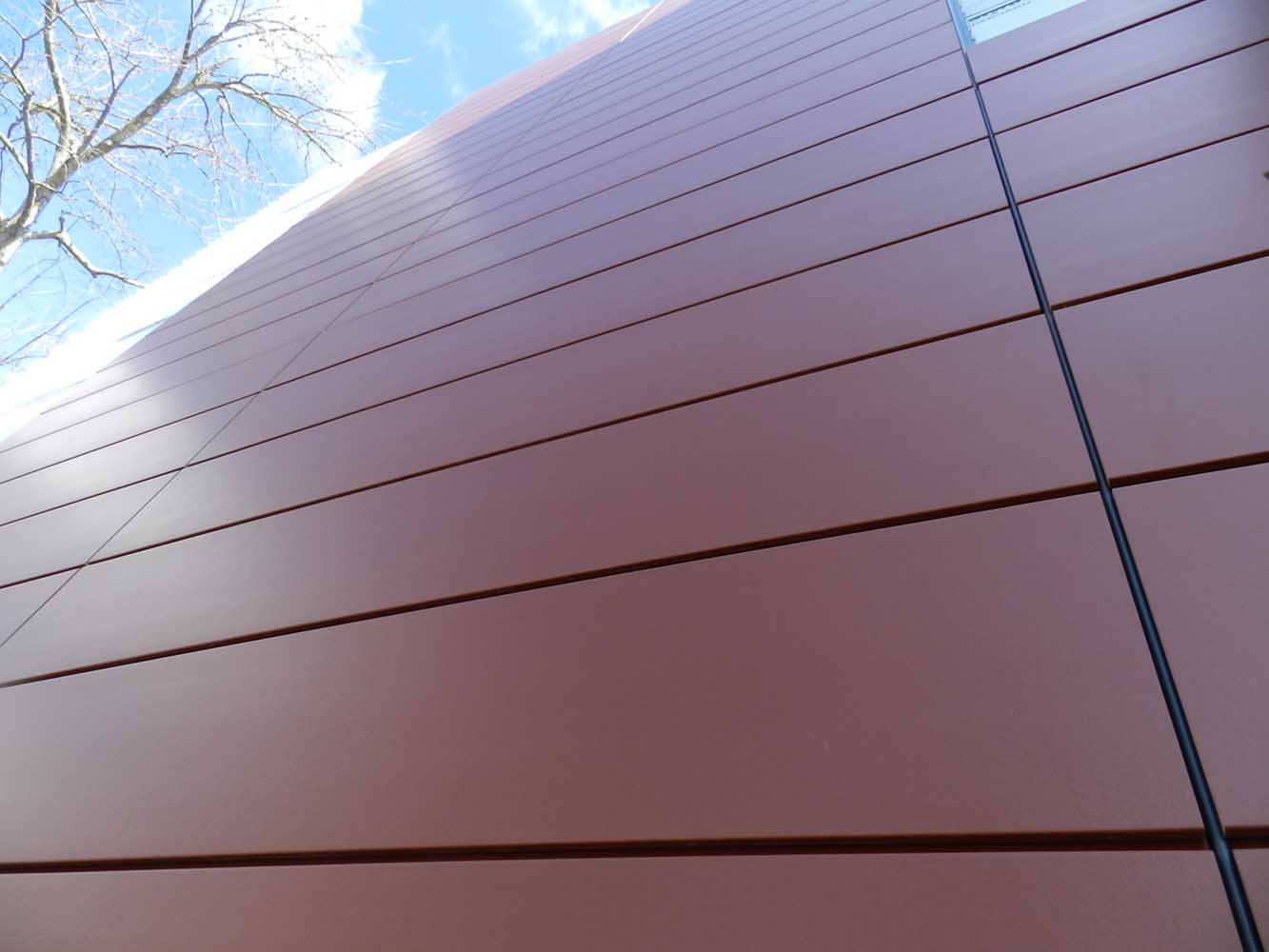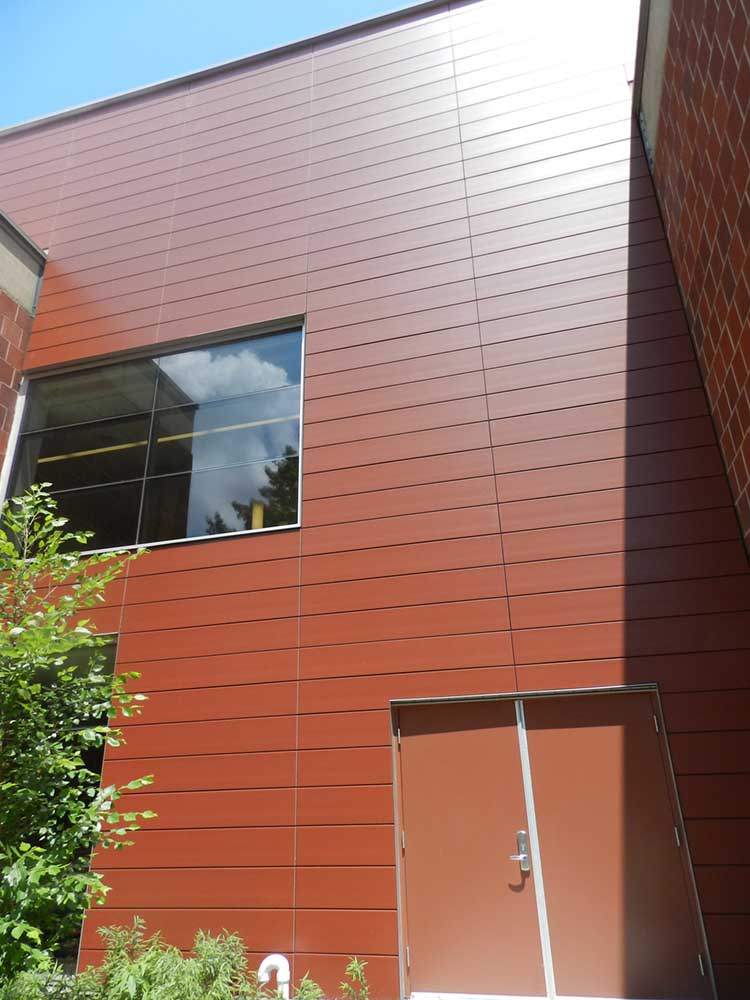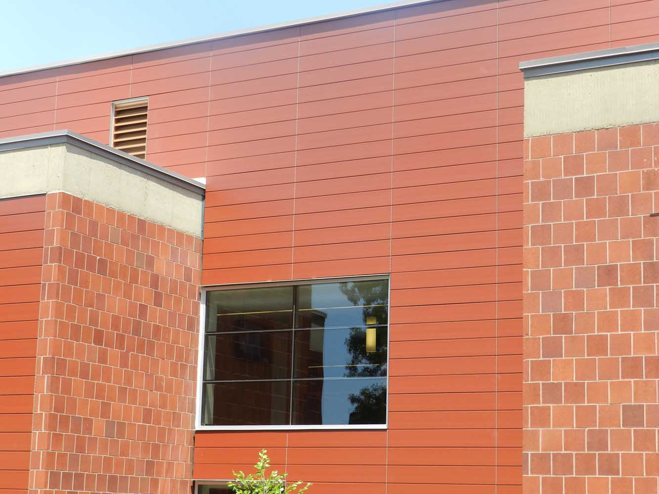 This renovated university fitness and wellness center was designed to promote the health & wellbeing of students in a safe, high-tech, and inviting environment. This state-of-the-art 2-story educational facility highlights the building’s original craftsmanship by retaining most of the original structure with additional new construction. Copper Red NeaCera rainscreens were chosen to complement the structure’s brick masonry and restored original terra-cotta walls. This building received LEED Gold Certification and renovation/construction awards.