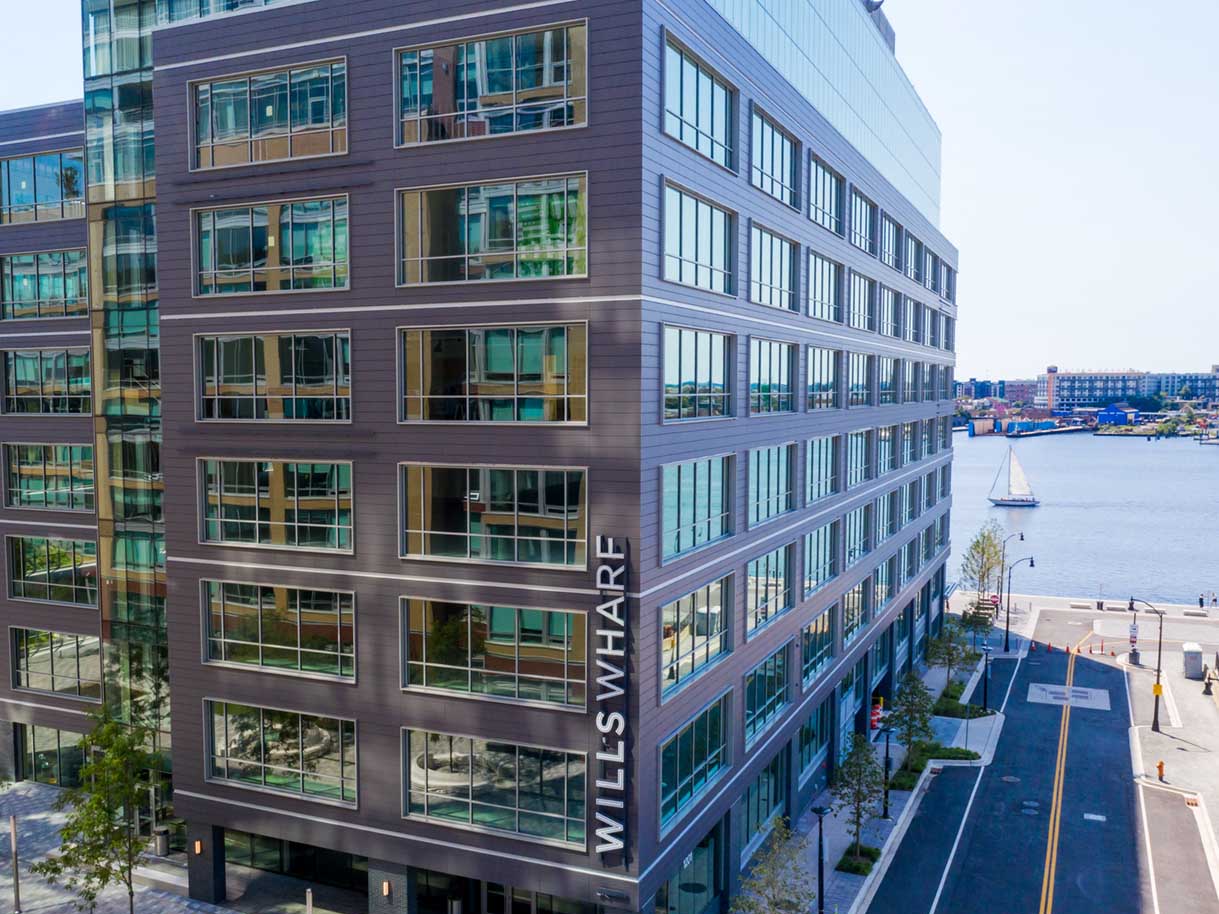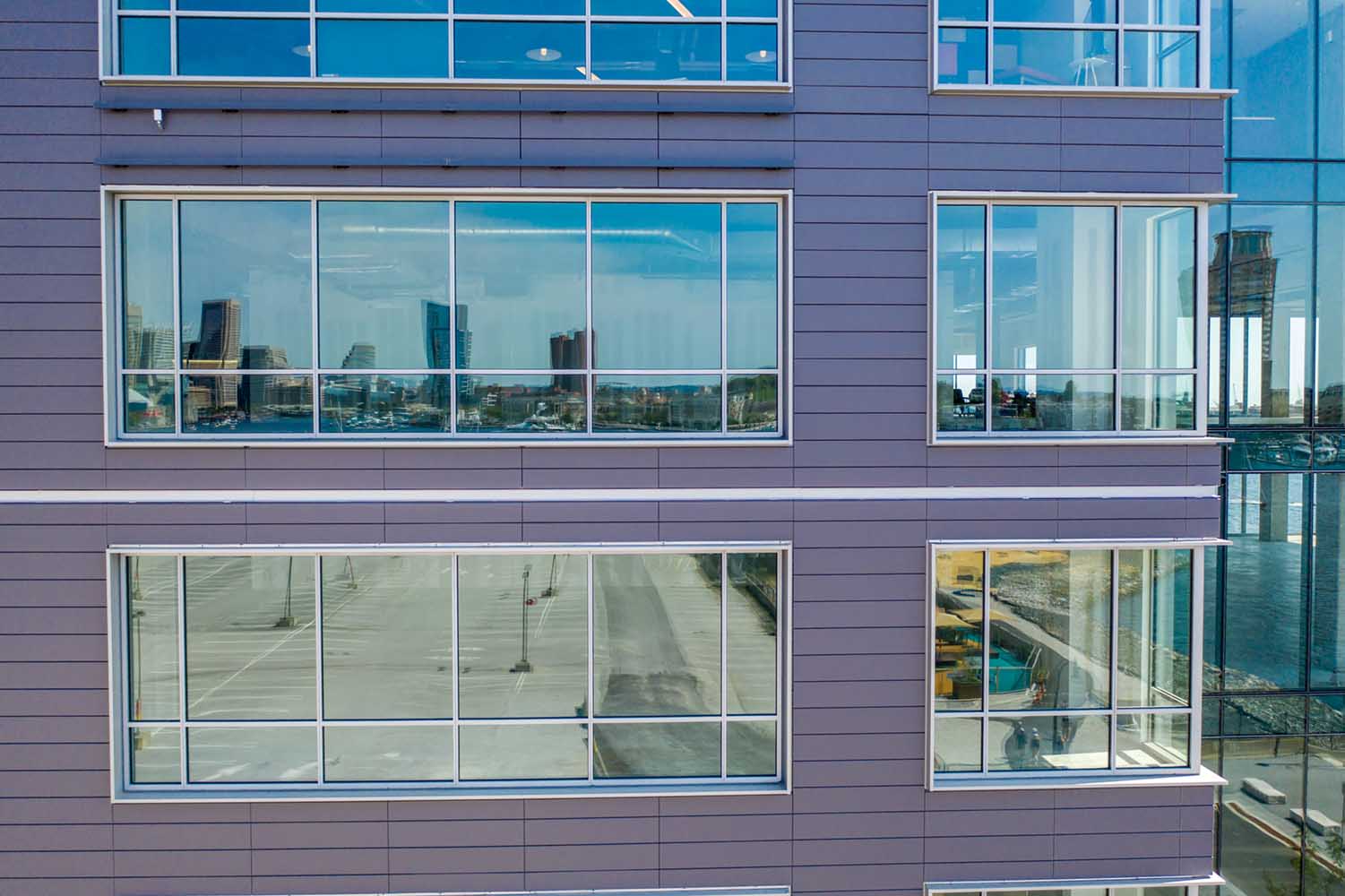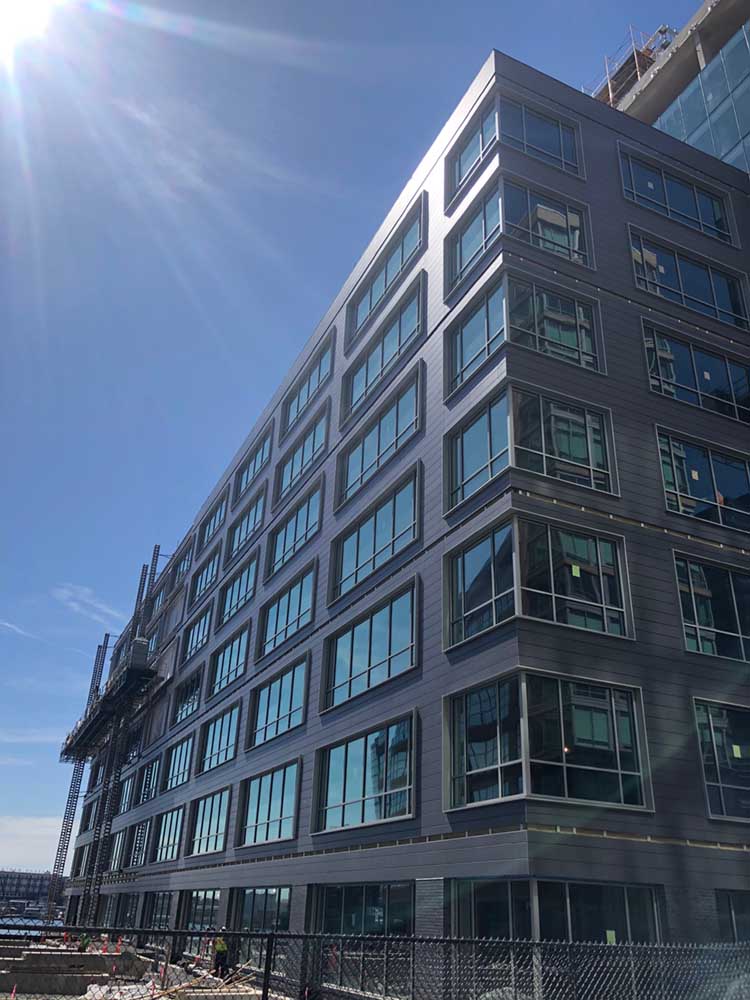 This mixed-use building located in a bustling city neighborhood features Dark Gray NeaCera Panels in the Flat Classic Shape. This 12-story, 330,000-square-foot building includes office, retail, and hotel space.